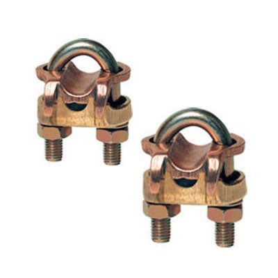 Grampo para haste ou tubo IPS de aterramento. Fabricado em bronze de alta condutibilidade elétrica e resistência mecânica. Parafuso tipo “U”, porcas e arruelas de pressão em bronze ou aço zincado.